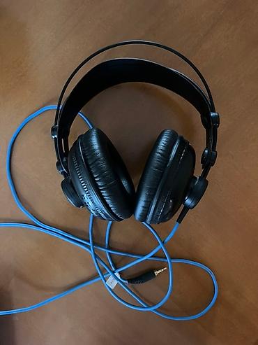 Полноразмерные наушники черного цвета с регулируемым оголовьем и мягкими амбушюрами. Модель оснащена синим кабелем, обеспечивающим подключение к источнику звука. На чашках наушников присутствует синий логотип, а на оголовье — надпись. Наушники подходят для прослушивания музыки, работы со звуком или использования в студии.