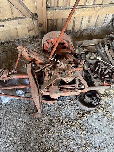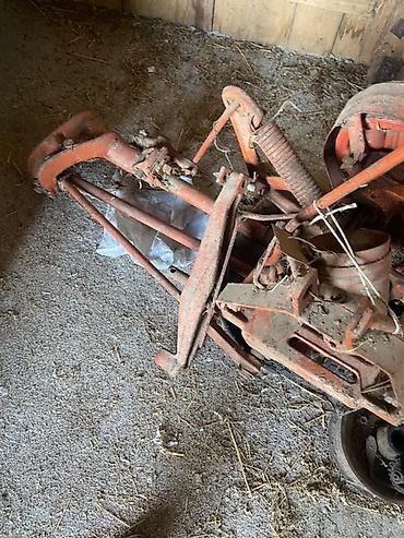 - В комплекте видны: рама косилки, косильный брус, рычаги управления, пружина разгрузки, шкивной привод с кожухом, элементы навески; рядом — запасные детали (шестерни/ролики).