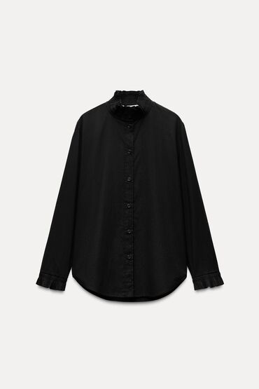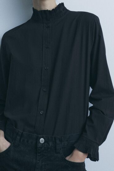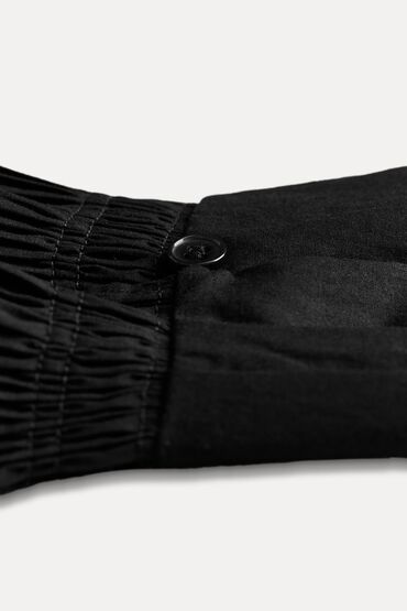 Женская блузка свободного кроя, Турция. Цвет: черный. V‑образный вырез с мягкой драпировкой, завязка-нить по центру. Длинные объемные рукава с присборенными манжетами. Легкая струящаяся ткань, асим...