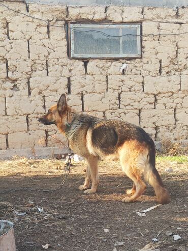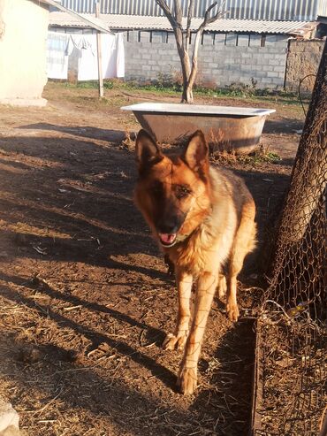 Немецкая овчарка, классический чепрачный окрас (рыжий с чёрным), густая шерсть, прямые уши, крепкий корпус. Собака среднего-крупного формата, активная, внимательная, с ярко выраженными охранными качествами. Подходит для дворового содержания, охраны участка и как компаньон для занятий дрессировкой.