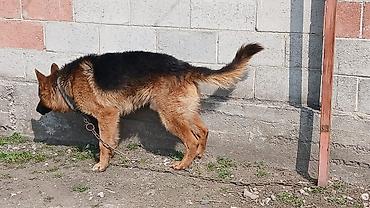 Немецкая овчарка, кобель. Классический чепрачный окрас: насыщенный черно-рыжий, плотная двойная шерсть с выраженным воротником. Крепкий костяк, широкая грудь, мощная шея с широким кожаным ошейником, правильная форма головы с прямыми стоячими ушами. Хвост пушистый, саблевидный. Пропорциональный корпус, ровная спина, уверенная стойка, хорошие углы задних конечностей.