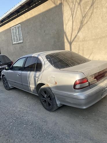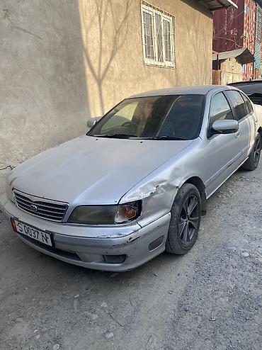 Седан Nissan Cefiro/Maxima (A33), серебристый цвет кузова. Основные характеристики: - Кузов: 4-дверный седан, тонированные задние стекла - Двигатель: бензиновый (по модели — V6 2.0–2.5 л; уточняйт...