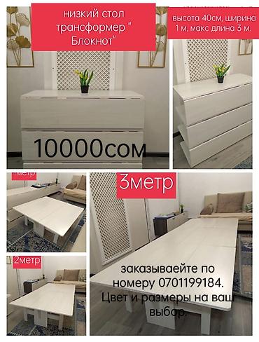 Функционален для гостиной, игровых зон и приёма гостей: в сложенном виде занимает минимум места, в разложенном — создаёт большую единую поверхность. Надёжные опоры по центру и по краям обеспечивают устойчивость на любой длине. Сделан из качественного ЛДСП материала. заказывайте любой размер, цвет и текстура материала на ваш выбор.