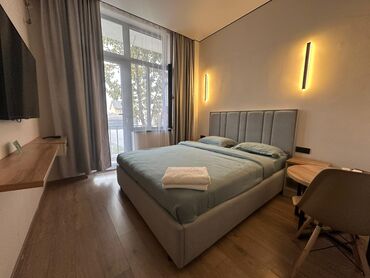 - Двуспальная кровать с мягким высоким изголовьем, комплект постельного белья и полотенца