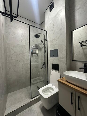 - Индивидуальная ванная комната просторная душ-кабина с тропическим душем и ручной лейкой, стеклянные перегородки, современный унитаз, умывальник-чаша на деревянной столешнице, зеркало, полки и держатели.