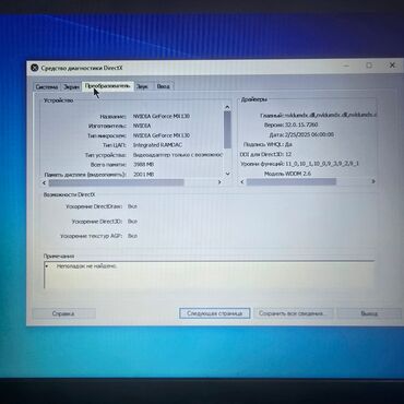 - Видеокарта: NVIDIA GeForce MX130 (модель WDDM 2.6), поддержка Direct3D DDI 12, WHQL; включены ускорения DirectDraw/Direct3D/AGP