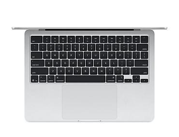 Apple MacBook Air 13.3 (серебристый) — компактный ноутбук с полноразмерной островной клавиатурой и большим стеклянным трекпадом Multi‑Touch. Раскладка — английская (US) с клавишами: esc, функциональный ряд F1–F12 с медиа‑управлением, стрелки в виде «перевёрнутой Т», отдельные клавиши option/command/control, клавиша fn. Тонкие рамки вокруг клавиатурного блока, низкопрофильные колпачки с подсветкой, чёткая разметка символов.