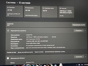- Процессор: AMD Ryzen 7 4800U with Radeon Graphics (8 ядер, базовая частота 1.8 ГГц)