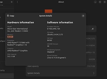 - ОС: Ubuntu 24.04.2 LTS (64-bit), окружение GNOME 46, Wayland; ядро Linux 6.14.0-35-generic