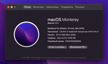 Ноутбук, Apple, 16 ГБ ОЗУ, Intel Core i7, 15.4 ", Б/у, Для работы, учебы, память NVMe SSD