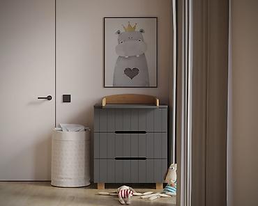 Комод Vikki также предлагает функциональность, заботясь о будущих мамах и их малышах. Съемный бортик превращает комод в практичный пеленальный столик, позволяя ухаживать за малышом на удобной высоте без нагрузки на спину.