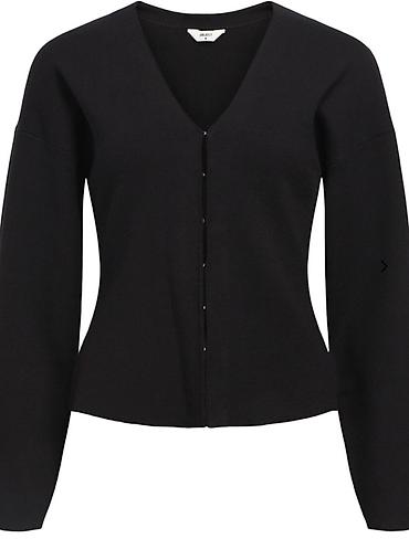 Женский кардиган/жакет на кнопках - Цвет: черный - Крой: прямой, длина до бедра - Застежка: ряд металлических кнопок по центру - Вырез горловины: круглый с небольшим V-надрезом - Рукава: длинные -...