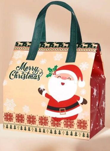 - Широкий пакет‑сумка с усиленными тканевыми ручками; бока и дно красные, с узором снежинок.
