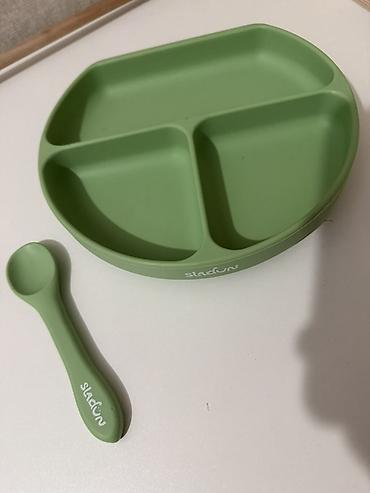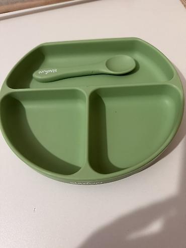 Детская силиконовая тарелка с разделителями + ложечка, зелёный цвет.