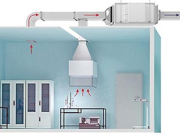 Вытяжная вентиляция. Предназначена для удаления загрязненного воздуха из рабочего пространства. Воздух выводится через специальные отверстия в стенах, потолке или полу. Такая система идеально подходит для небольших лабораторий, где необходимость в большом притоке свежего воздуха минимальна.