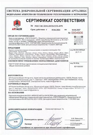 - Правовой статус: изделие относится к туристическим ножам, не является холодным оружием. В комплекте прилагается сертификат соответствия (ГОСТ Р 51501-99, добровольная сертификация, срок действия 05.06.2024–04.06.2027), указана продукция «нож туристический», производитель ИП Исмаилов Исмаил Илгар оглы.
