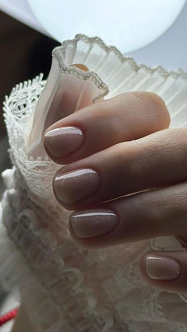 - Выполнение: покрытие гель-лаком/шеллаком в натуральной гамме с полупрозрачным молочно-розовым оттенком.