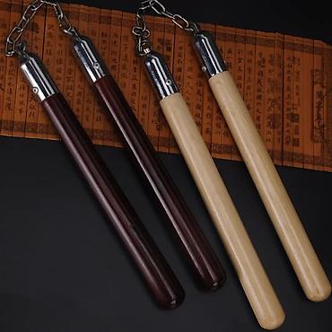Нунчаки тренировочные - Рукояти: деревянные, полированные, покрыты лаком; жёсткие и утяжелённые для уверенного хвата. Диаметр ~3 см, длина каждой рукояти ~30 см. - Цепь: длина ~22 см. Свободное в...