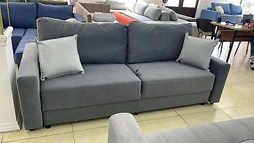 Раскладной диван. Серый диван-кровать с тканевой обивкой, оснащенный механизмом трансформации для создания дополнительного спального места. Модель имеет встроенный ящик для хранения белья, что позв...