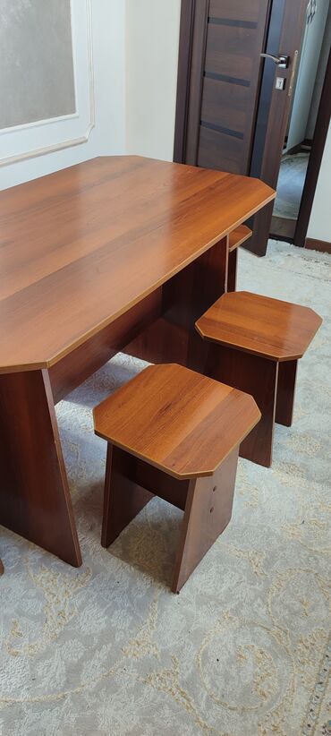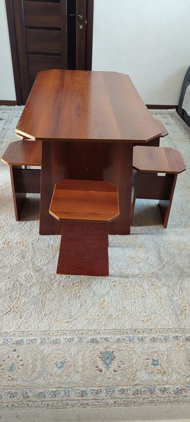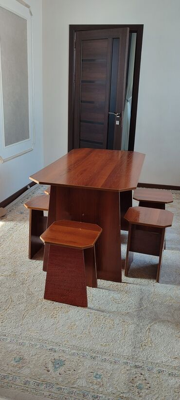 Обеденный набор из ЛДСП в стиле “под мрамор” Состав: - прямоугольный стол - 4 табурета с мягкими сиденьями Дизайн и варианты: - две расцветки: белый мрамор с золотистыми прожилками и чёрный мрамо...
