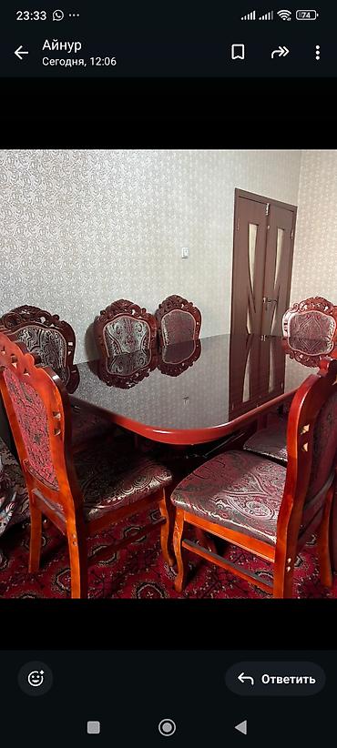 - Набор резных стульев из массива в тоне «махагон». Мягкие сиденья и спинки, обивка жаккардового типа с восточным/пейсли-узором в бордово-зеленой гамме.