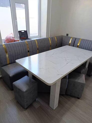 Кухонный обеденный набор из 5 предметов. Состав: - стол прямоугольный; - 4 табурета. Дизайн и материалы: - выполнен в светлом мраморном декоре (белая поверхность с серыми/золотистыми прожилками);...