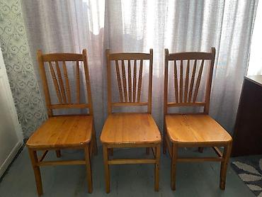 - Стулья деревянные, со спинкой рейками и декоративными точёными элементами; сиденье — цельная деревянная плита. В комплекте 3 шт.