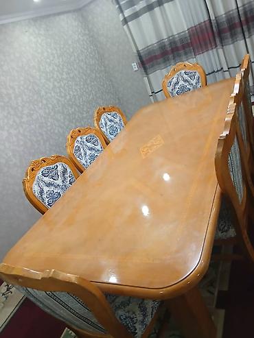 Размеры визуально: стол рассчитан на 8 мест, с комфортной посадкой по 3 стула с длинных сторон и по одному с торцов. Мебель в классическом стиле, сочетается с интерьером в светлых и нейтральных тонах.
