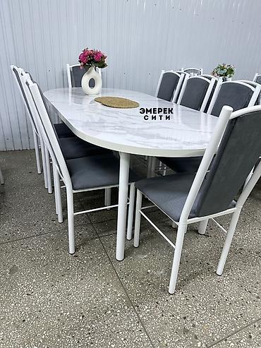 Комплектация на фото: овальный стол и восемь стульев. На столешнице фирменная маркировка «Эмерек Сити».