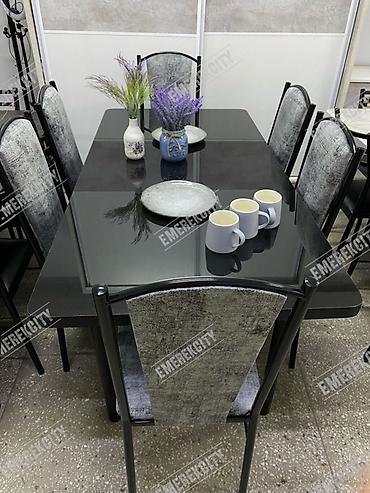 - Дизайн: современный минимализм — сочетание чёрного стекла и графитовой обивки; подходит для кухни, гостиной или кафе.