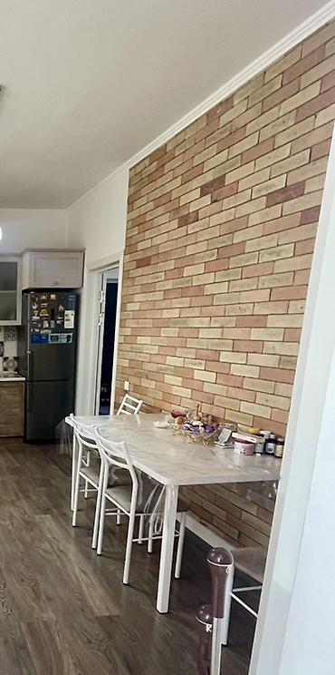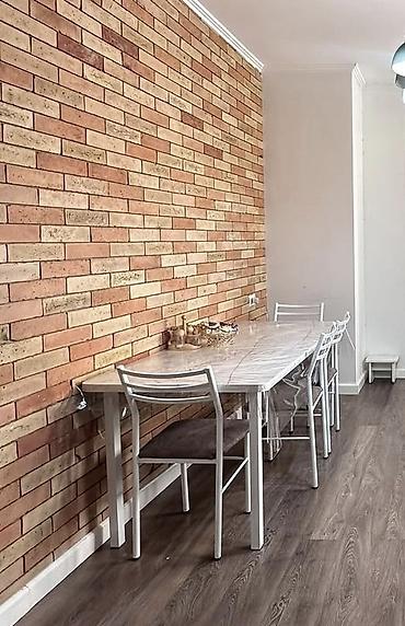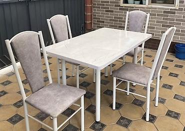 - Стол прямоугольный, размер длина 150 на 80 см. Столешница светлая, с эффектом белого мрамора и закруглёнными углами; поверхность легко моется. Ножки металлические, окрашены в белый цвет.