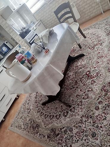 - Классический прямоугольный стол на массивном деревянном основании с Т‑образными опорами. Столешница покрыта прозрачной защитной скатертью (ПВХ).