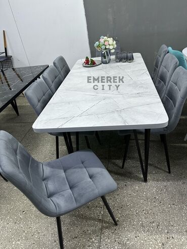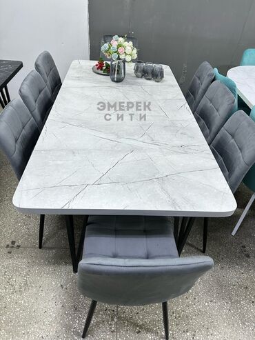 Обеденная группа в современном стиле: прямоугольный стол мраморной столешницей и комплект мягких стульев.