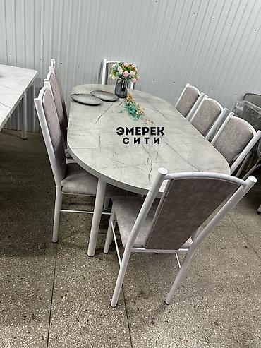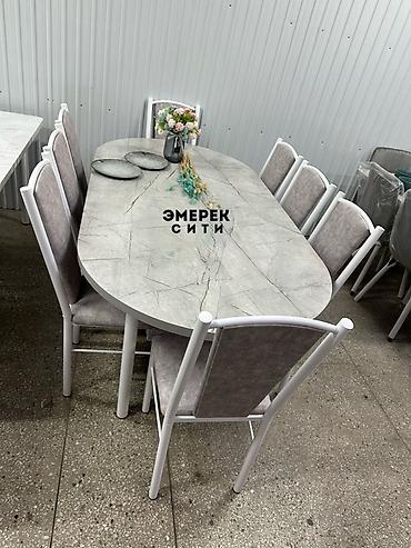 Комплектация: овальный стол + 8 стульев. На фото — реальный вид набора. На столешнице и стульях фирменная маркировка «ЭМЕРЕК СИТИ».