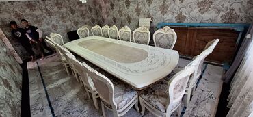 Большой обеденный стол с резными ножками и белой столешницей, украшенной узорами. Вокруг стола расположены стулья с высокой спинкой, обтянутые тканью с цветочным орнаментом. Комплект выглядит элега...