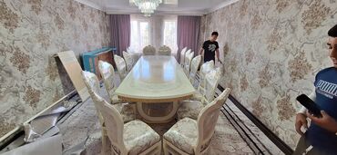 Большой обеденный стол с резным декором и двенадцатью стульями в комплекте. Стол имеет прямоугольную форму с овальной вставкой в центре столешницы. Стулья с мягкой обивкой и резными спинками выполн...