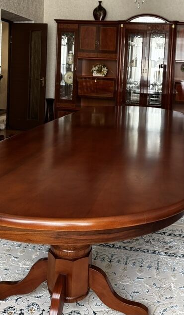 Классический обеденный гарнитур: большой овальный стол и стулья - Стол овальной формы из массива/шпона темного дерева с глянцевым покрытием. - Раздвижная столешница с центральной вставкой: виден ...