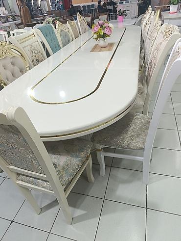 Обеденный гарнитур в классическом стиле: большой прямоугольный стол и 10 стульев. не давно купили за 115000сом почти новый - Стол: вытянутой прямоугольной формы с скошенными углами, массивная цен...