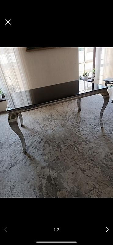 - Стол прямоугольный, с глянцевой темной (черной) столешницей. Основание и изогнутые ножки — металл с зеркальной/хромированной отделкой, придающей современный, эффектный вид и визуально «облегчающей» конструкцию. Устойчивый, рассчитан на 4–6 персон.
