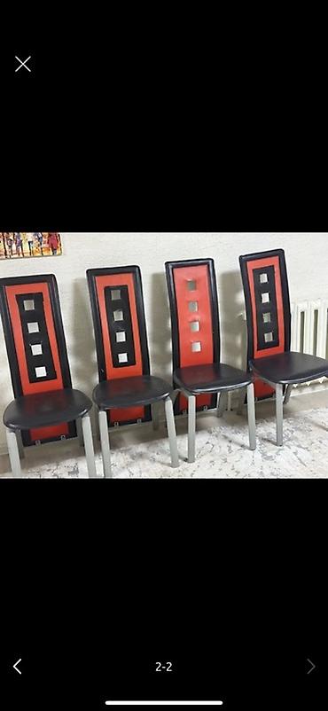 - Стулья (4 шт.) в одном стиле: высокие спинки с декоративными квадратными вырезами, комбинированная отделка черного и красного цветов. Сиденье темное, ножки светлые. Дизайн контрастный, подходит для современной кухни или столовой. В подарок при покупке стола!!!!