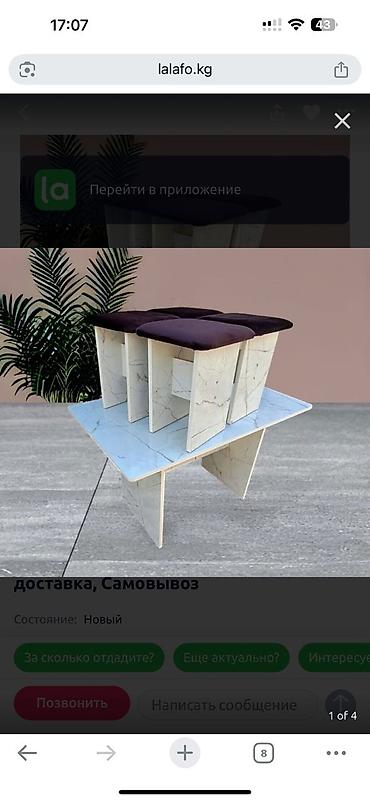 - Комплект компактно собирается: табуреты задвигаются под стол.