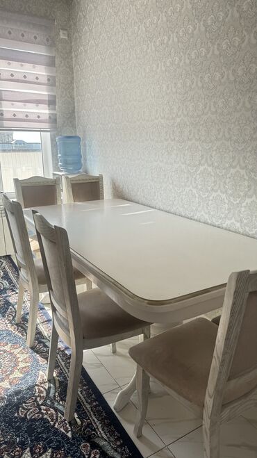 Продаётся элегантный прямоугольный обеденный стол светлого оттенка с окантовкой и 6 мягкими резными стульями. Изготовлен на заказ от «Мебель Карагач», в отличном состоянии, использовался мало, требуется лишь покраска. Причина продажи — не помещается в квартире.