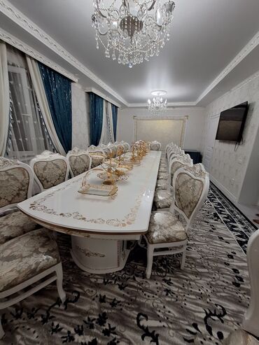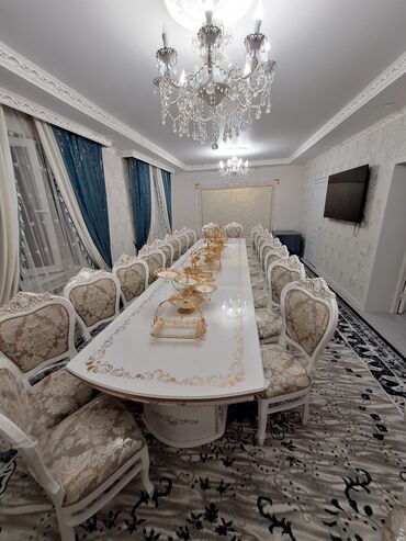 Большой обеденный стол в классическом стиле с белой столешницей, украшенной золотистым орнаментом. Стол дополнен комплектом из восемнадцати стульев с мягкой обивкой в светлых тонах с цветочным рисунком. Массивное основание стола обеспечивает устойчивость и надежность. Подходит для просторных столовых или залов для приема гостей.