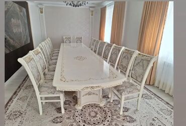Большой обеденный стол с резным декором и двенадцатью стульями в комплекте. Стол имеет прямоугольную форму с овальной вставкой в центре столешницы. Стулья с мягкой обивкой и резными спинками выполн...