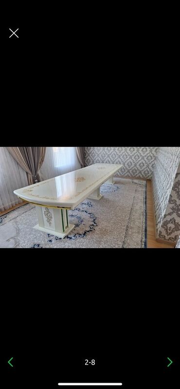 Предлагается большой обеденный стол с белой глянцевой столешницей, украшенной золотистым орнаментом. Стол имеет массивные резные ножки, также декорированные золотом. Он идеально подойдет для просто...