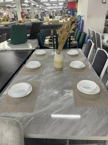 Обеденный стол с мраморной столешницей и комплектом стульев. Стол имеет овальную или прямоугольную форму и доступен в различных цветах, включая белый, черный и серый. Прочная столешница из искусств...