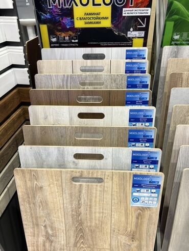 Образцы ламината Ecologik и Mixology с влагостойкими замками. Представлены различные оттенки и текстуры, имитирующие натуральное дерево. Ламинат предназначен для укладки на пол в жилых и офисных помещениях. Замковые соединения обеспечивают легкую и быструю сборку, а влагостойкость позволяет использовать его в помещениях с повышенной влажностью.
