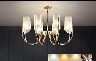 - Свет: мягко рассеиваемый, без ослепления благодаря фактурным стеклянным экранам; имеет 3 вида освещения (холодный, теплый, нейтральный) подойдёт для освещения гостиной, столовой, спальни, холла.