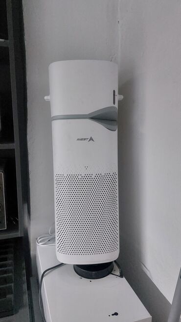 - Компактный напольный/настольный прибор белого цвета с перфорацией по корпусу для забора воздуха