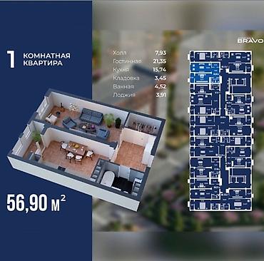 ПРОДАЕТСЯ 1-комнатная квартира 56,90 кв.м. в ЖД «Bravo» в Бишкеке.
